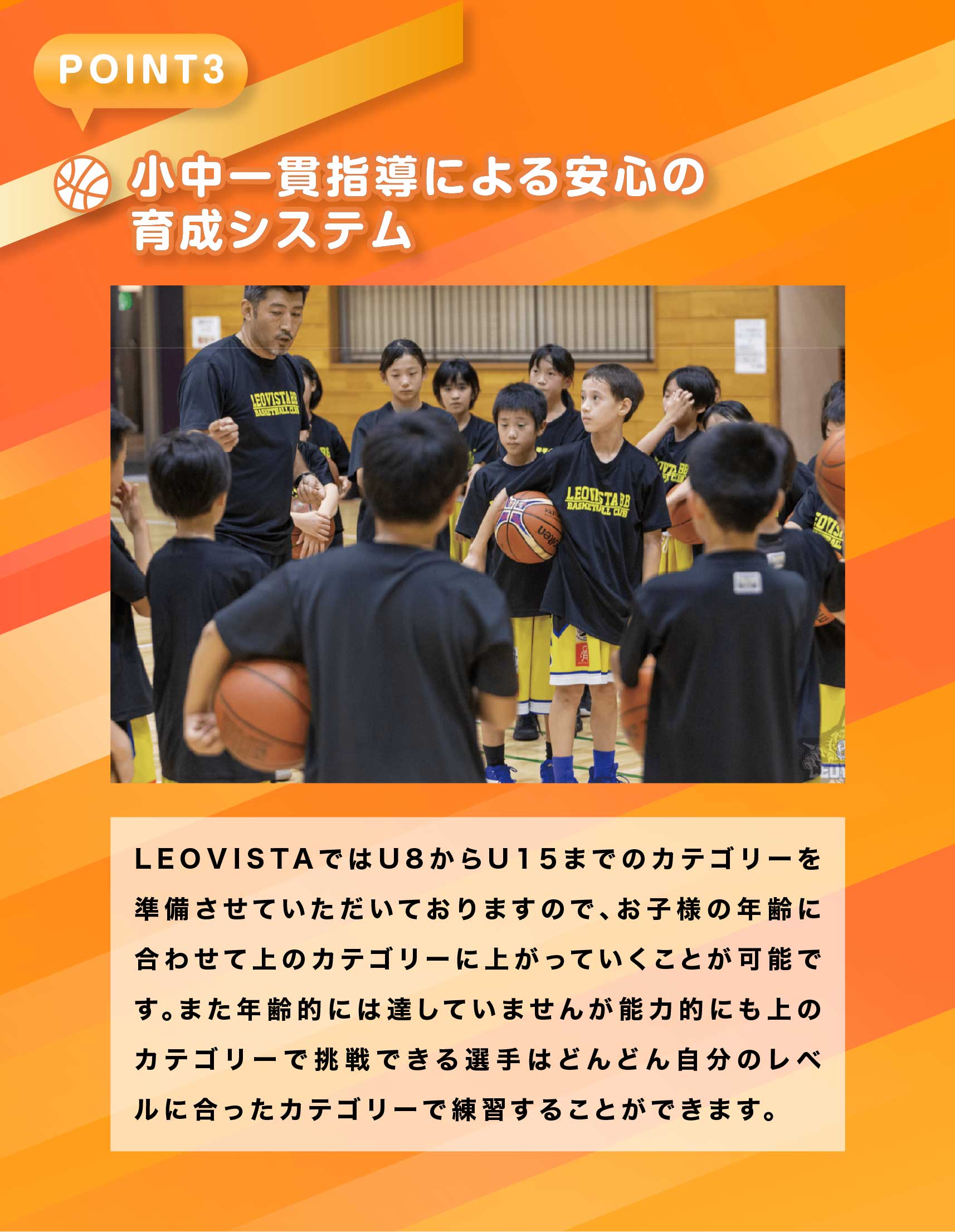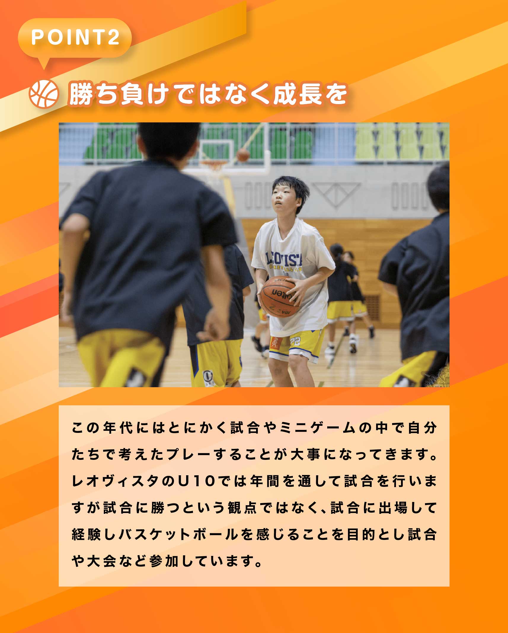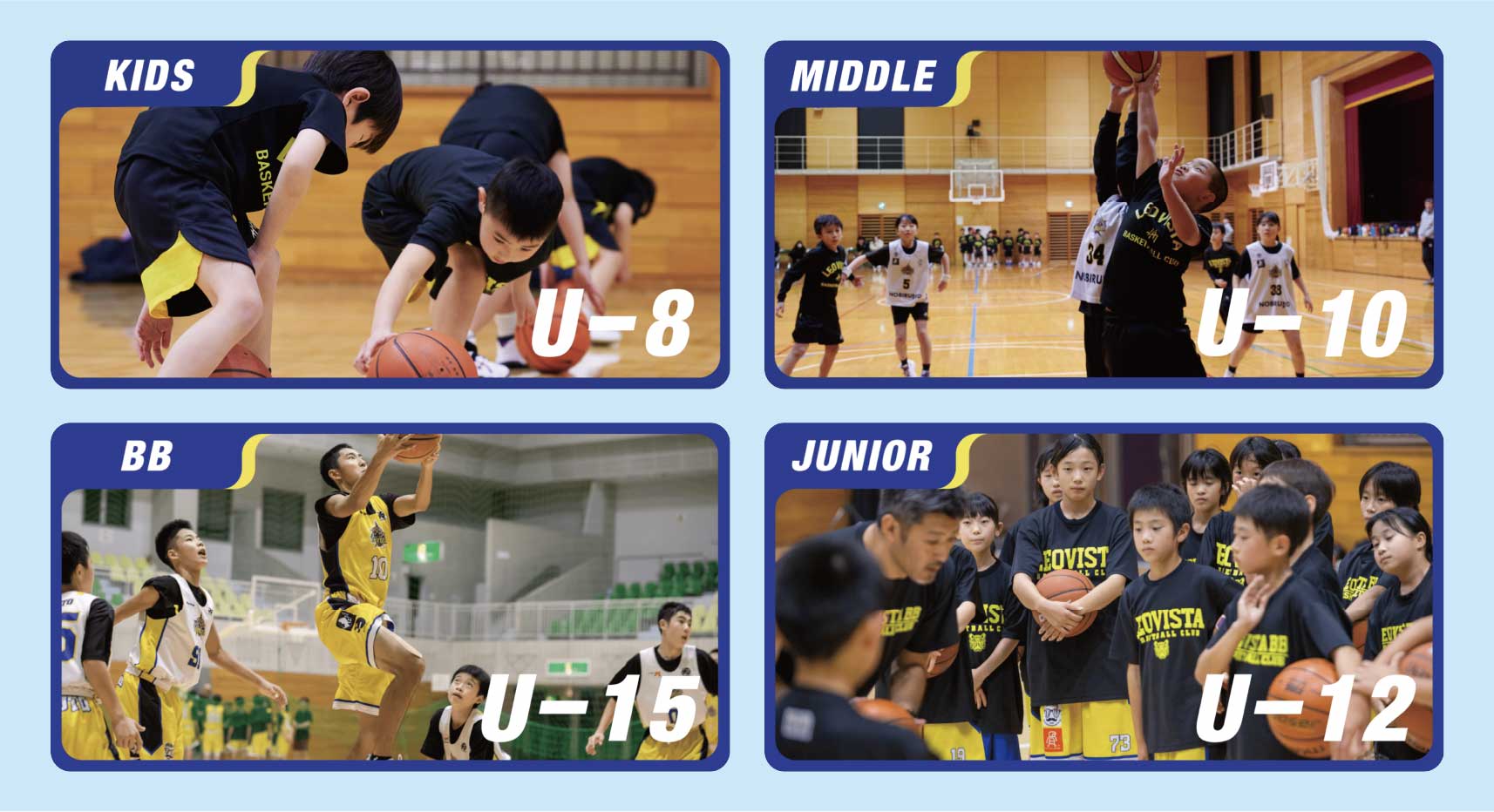 基本的には9歳~10歳までを対象としておりますが、11際・12歳でもバスケットボール未経験の場合につきまして半年間U10で練習することを可としております。